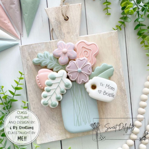 In this hands-on class, you’ll decorate a beautiful bouquet-inspired cookie set complete with soft pastel florals, leafy details, and a customizable “To: Mom” tag cookie — perfect for gifting (or keeping 😉).